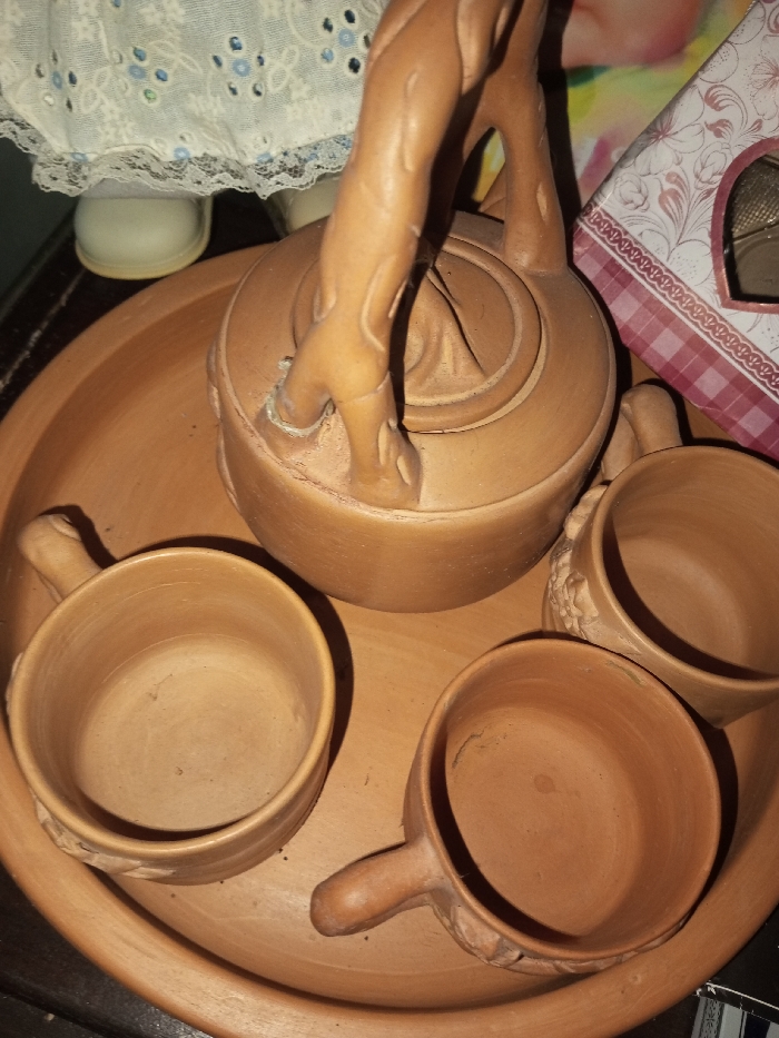 A terracotta tea set is displayed on a matching tray. The set includes a teapot with a sculpted handle resembling intertwined branches and three cups, each with a small handle. Floral patterns are carved near the handles of the cups. The teapot sits centrally on the tray, surrounded by the cups. A porcelain doll and a patterned box are partially visible in the background.