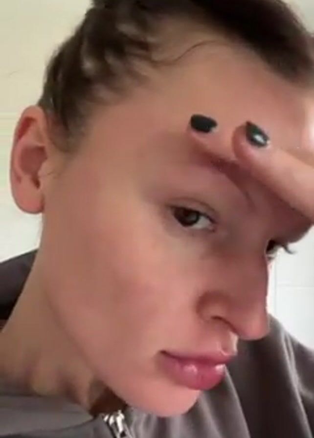 A fair-skinned woman is facing the camera with her hair pulled back in a bun. She is wearing a gray zip-up hoodie. She is looking directly at the camera with a neutral expression, then she touches her forehead and eyebrows with both hands. The background appears to be a white tiled wall.