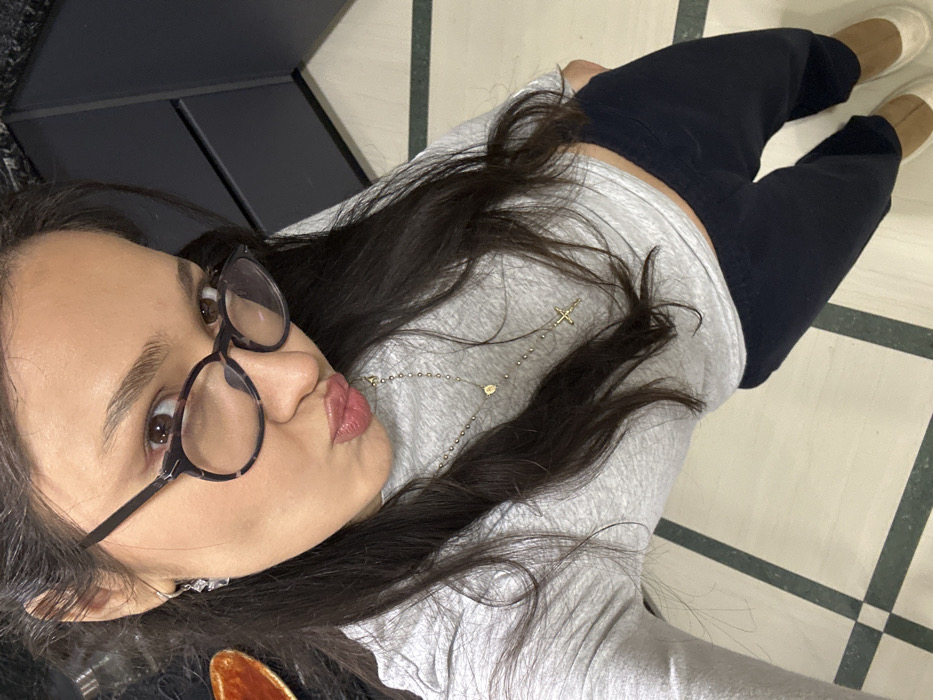 An indoor, high-angle selfie captures a young adult female with long dark hair, wearing tortoise-shell glasses, a light grey long-sleeve top, dark blue trousers, and light brown flat shoes