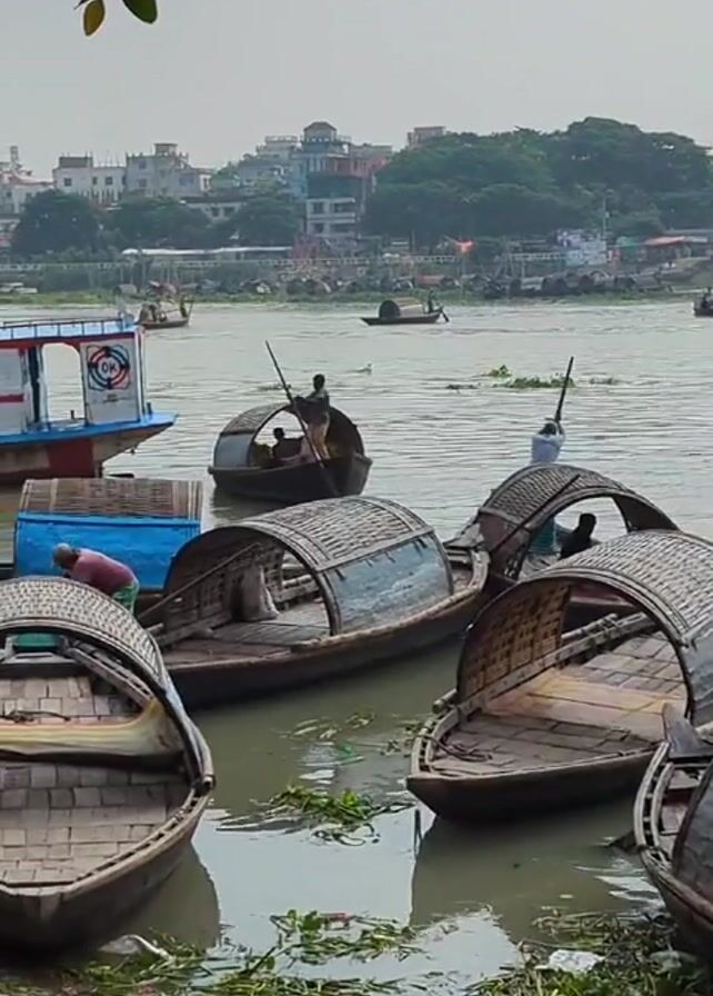 riverbank with several wooden boats, some with arched bamboo coverings, docked along the shore. In the background, other boats are moving on the water. Several people are visible in and around the boats. The riverbank is covered with vegetation. A building and trees are visible in the background.