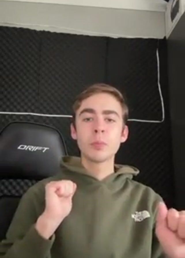 A young man with light brown hair and blue eyes sits in front of a microphone wearing an olive green hooded sweatshirt with a white logo on the left breast. He is performing a beatboxing routine, moving his hands in coordination with the sounds. He is seated in a black “DRIFT” gaming chair. The background is a black, sound-absorbing panel with a white trim. A white box is visible in the top right corner of the frame.