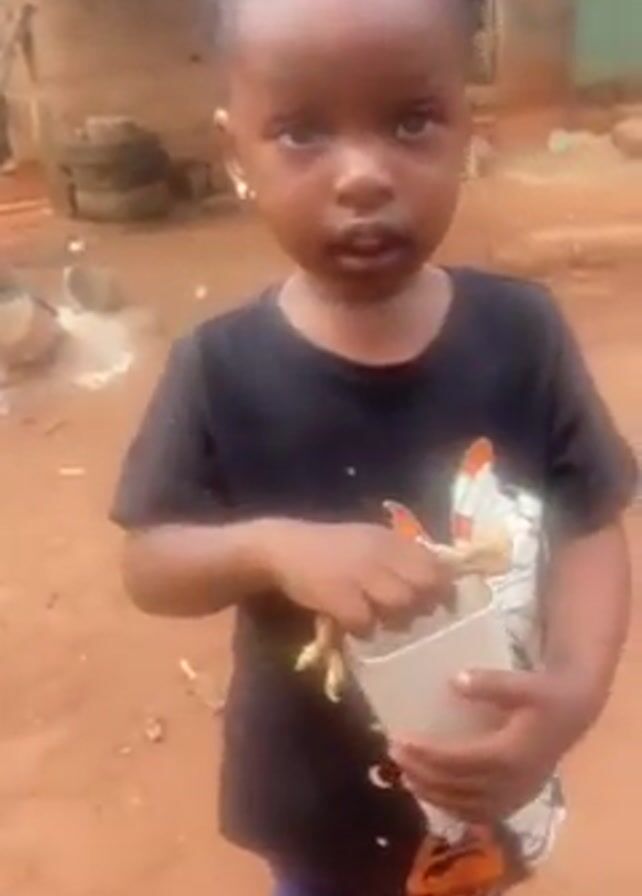 A young African-American girl stands outside on red dirt. She wears a black shirt with a printed design, patterned purple leggings, and earrings. Her hair is styled in braided buns with silver accents. In her right hand, she holds a cooked chicken foot, and in her left hand, she holds a white cup with a printed design. She examines the chicken foot. The background includes a building and some scattered objects.