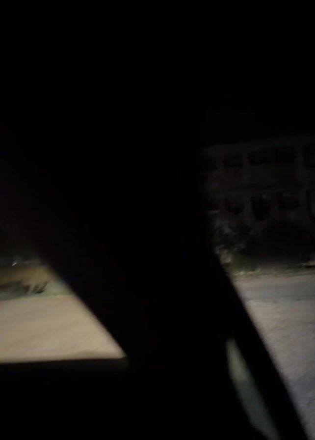 The video, shot from the interior of a car, starts with a view of a dilapidated, multi-story building at night, illuminated by the car's headlights