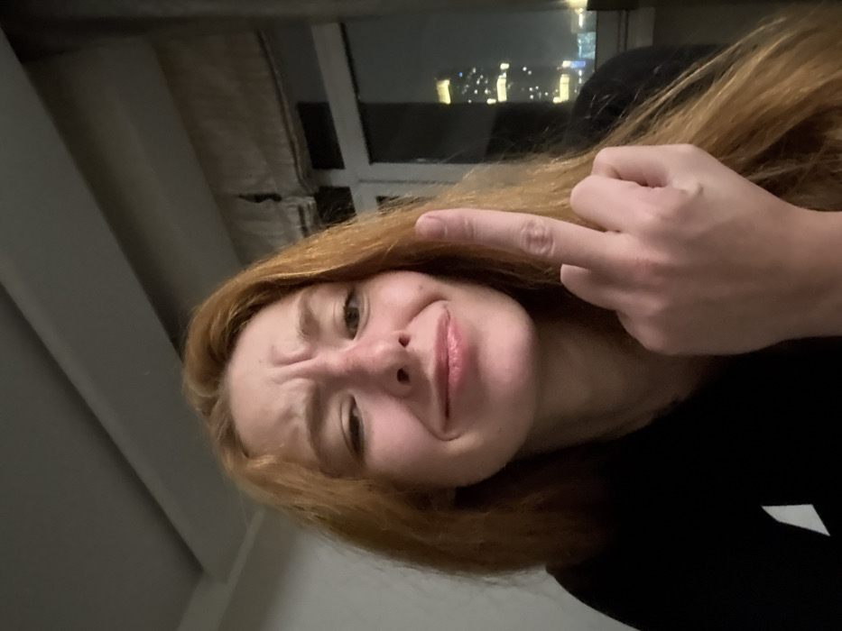 The image displays a female individual indoors at night, situated in what is identified as Khimki, Russia. The subject has long, reddish-blonde hair and is positioned facing the camera. Her facial expression includes a furrowed brow and a slight downturned smirk, with a visible reddish discoloration on the bridge of her nose. Her right hand is raised, with the middle finger extended upwards towards the viewer. She is wearing a dark-colored, likely black, top. The background to the upper left features a light-colored ceiling and an architectural beam. To the right, a window reveals a dark night sky and the illuminated upper sections of multiple distant high-rise buildings, characteristic of a metropolitan skyline. The interior lighting is low, with the primary illumination appearing to originate from the camera's direction, contrasting with the visible external city lights.