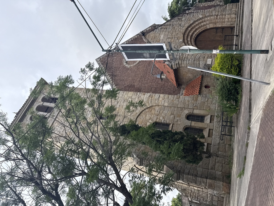 This image displays the Parroquia Santa Teresita del Niño Jesús in Martínez, Buenos Aires Province, Argentina. The primary subject is a large, multi-story ecclesiastical building constructed predominantly of light-colored, rough-hewn stone blocks. It features a prominent bell tower with arched openings near its apex and a tiled roof. A section of the building to the right exhibits reddish-brown brickwork with a distinct stepped gable. A large, rounded arched entrance with wooden doors is visible on the building's right side, adjacent to a smaller structure with a red tile roof. Arched windows are interspersed across the stone walls. In the foreground, a sidewalk composed of concrete and reddish-brown brick pavers is present. A substantial tree with green foliage partially obscures the upper left portion of the bell tower. A tall, narrow evergreen tree stands against the stone wall of the church, with various bushes and ground cover plants at the base of the building. A dark green utility pole is prominent on the right, supporting multiple overhead wires, a street lamp fixture, and a vertical white rectangular sign. A silver-colored pole leans diagonally on the ground in the lower right foreground. Black metal handrails are visible leading up a slight incline towards the church entrance. The sky is uniformly overcast. No individuals are present, and no actions or interactions are depicted.