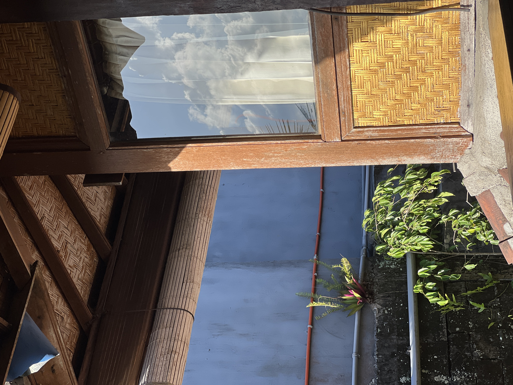 n exterior view from a building in Ubud, Indonesia. A window with a wooden frame reveals a sky reflection with clouds, obscured by a sheer curtain. Adjacent to the window is a section of woven bamboo. Below, a blue-painted exterior wall is visible, alongside a pipe running vertically. Green foliage spills over a dark, textured wall. A vibrant bromeliad sprouts near the pipe. The architectural structure suggests a traditional Indonesian style.