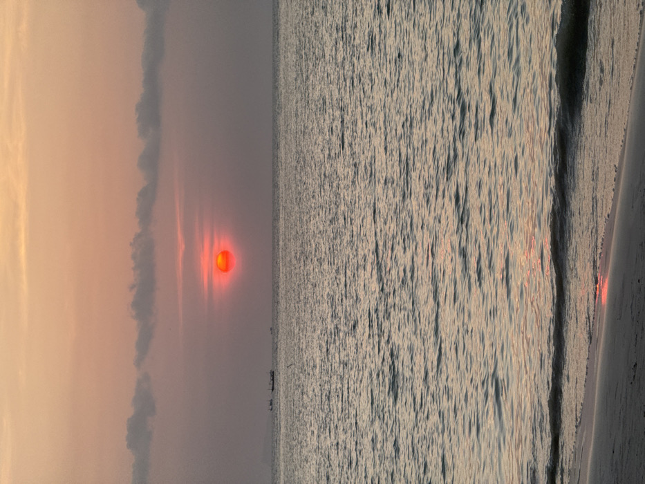 A sunset scene is depicted from a sandy beach in Baan Sri Thanu, Thailand. The horizon is dominated by a prominent, circular, bright red-orange sun positioned centrally in the upper mid-sky, partially diffused by atmospheric conditions. The sky above transitions from a light peach-orange at the top to a muted greyish-pink closer to the horizon. Several horizontal, dark grey clouds are situated directly above the setting sun. Below the horizon, the sea exhibits gentle ripples and reflects the ambient light with faint orange and pink hues, forming a subtle shimmering path directly beneath the sun. On the left side of the horizon, a faint, dark landmass or distant island is discernible. Two small, dark vessels, possibly fishing boats, are visible on the water's surface to the left of the sun. The foreground consists of a wet, dark sand beach, where shallow waves gently break. A thin line of white foam marks the edge of the water. Reflections of the sunset colors are visible on the wet sand at the bottom of the frame. No individuals or specific actions are visible in the scene.