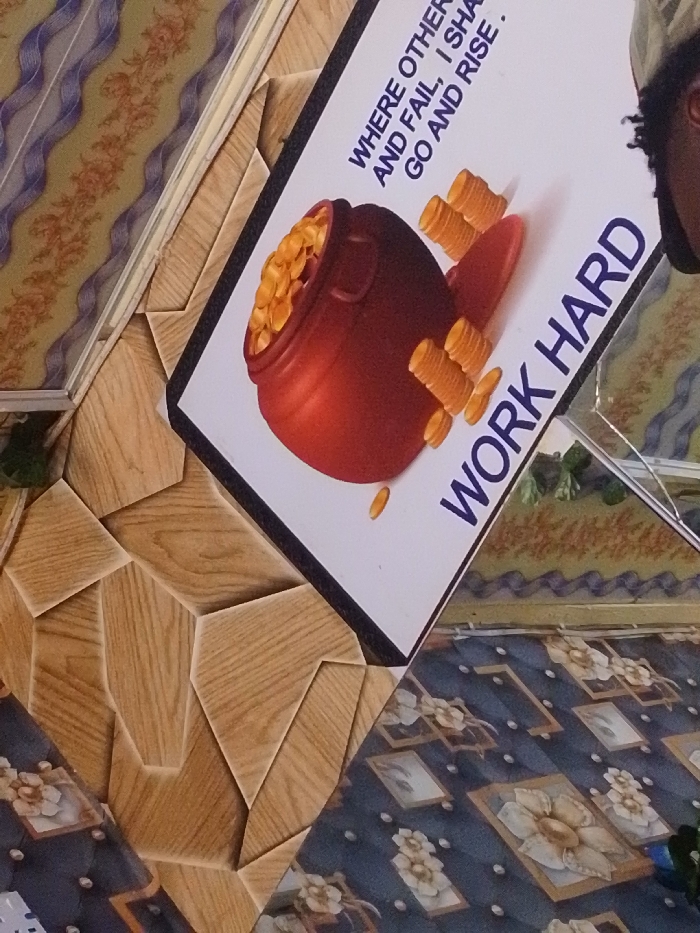 An interior scene in Enugwu-Ukwu, Nigeria, captured at an approximate 45-degree clockwise rotation. The primary subject is a rectangular motivational poster with a black border, set against a multi-patterned background. The poster has a white background. It features large, bold blue text vertically aligned on the right, reading "WORK HARD". Above this, smaller blue text reads "WHERE OTHERS AND FAIL, I SHA GO AND RISE." The central illustration depicts a reddish-brown pot overflowing with numerous gold-colored coins. Several stacks of gold-colored coins are positioned to the right of the pot, with a few individual coins scattered below. The upper-right portion of a person's head is visible at the extreme right edge of the frame. The individual has dark skin and textured dark hair, and is wearing a light-colored cap. The environment behind and around the poster consists of multiple patterned surfaces: 1. To the left of the poster, a light-brown surface displays a wood-grain pattern composed of interlocking, irregularly shaped geometric panels. 2. Above this wood-grain surface, a patterned wall or textile features horizontal wavy blue/purple stripes and an orange-brown floral or leaf design on a light beige background. 3. Below and to the right of the poster, a dark blue surface exhibits a repeating pattern of lighter beige/white floral designs enclosed within rectangular outlines, interspersed with small light blue circular dots. This surface appears glossy or reflective, showing faint reflections including hints of green foliage. No specific actions or interactions are depicted beyond the static display of the poster and the partial presence of an individual.