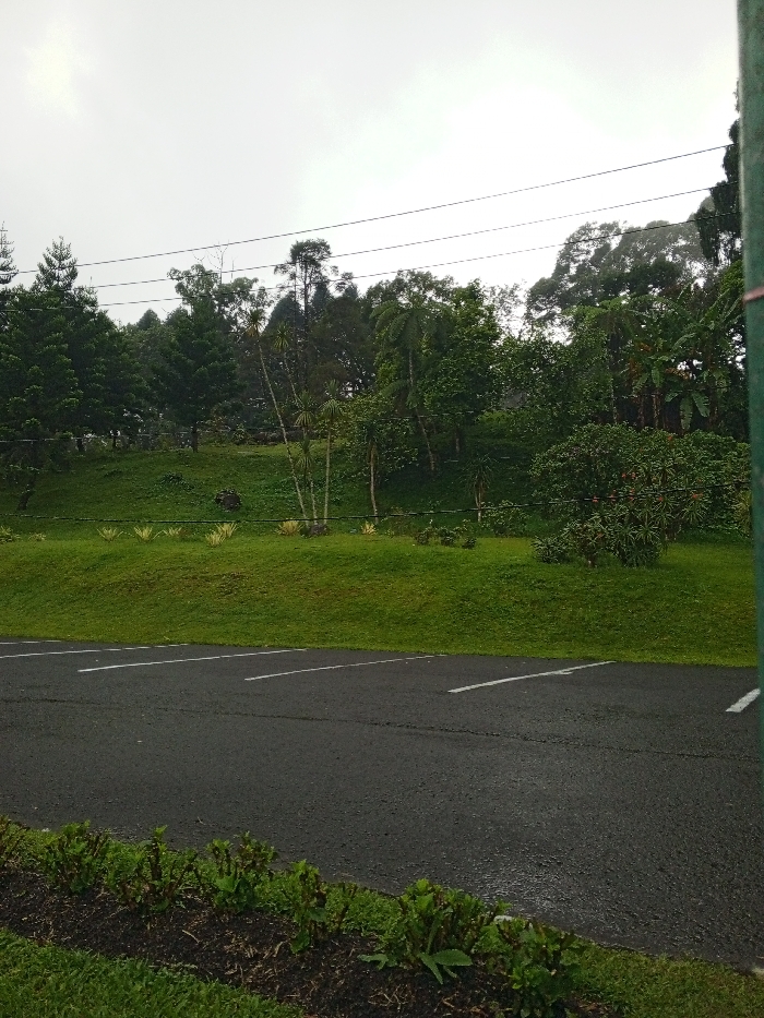 A parking lot with white lines stretches across the foreground. The asphalt appears wet. Beyond, a grassy hill slopes upward, dotted with trees and shrubs of varying sizes and types. A small row of flowering plants lines the base of the hill. Overcast skies filter the light, creating a muted color palette. Overhead, electrical wires are visible. The scene exudes a tranquil, almost melancholic atmosphere.