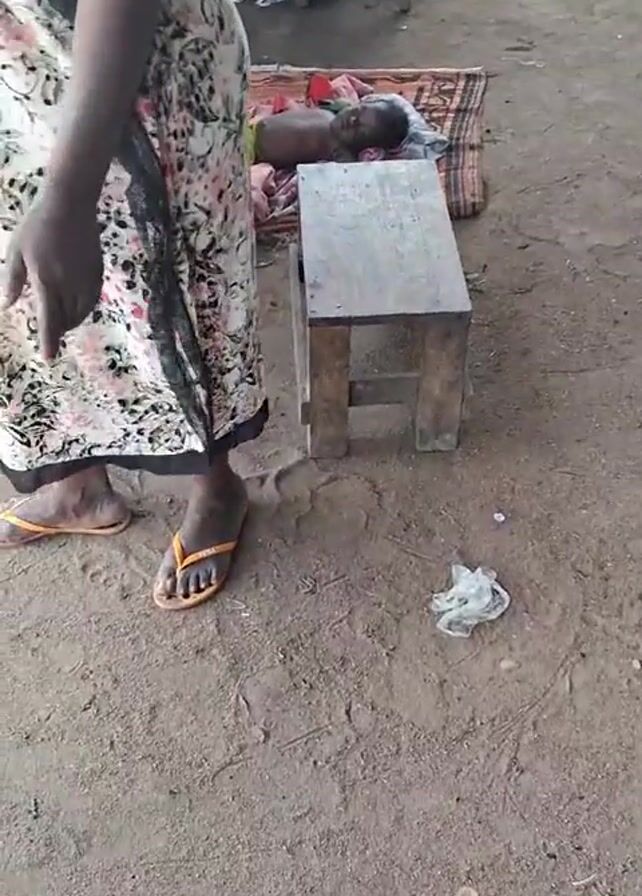 A child is lying on a patterned mat on the ground, next to a small wooden stool. The child is wearing yellow shorts and appears to be sleeping. An adult female is standing next to the stool. She is wearing a patterned dress and orange flip-flops. The ground is dirt and there are several pieces of litter scattered around. In the background, there are some benches and a plastic chair.