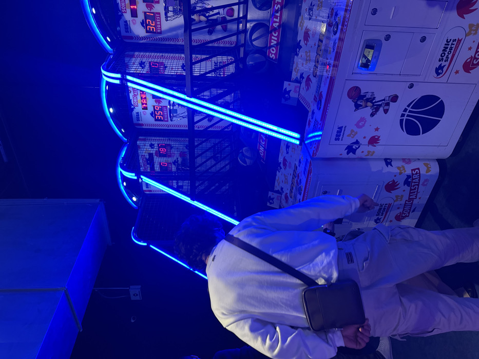 The image displays an indoor entertainment venue in Saint-André-lez-Lille, France, illuminated predominantly by blue ambient light. One individual is centrally positioned, viewed from the back, standing in front of a row of three "Sonic Allstars" basketball arcade games. This individual is a male with dark, medium-length curly hair, wearing a white long-sleeved crew-neck shirt, light-colored cargo pants, and a dark brown or black cross-body bag over his right shoulder. His hands are lowered towards the control panel area of the arcade machine directly in front of him. The arcade machines are characterized by neon blue illuminated archways and vertical light strips. Each machine displays "SEGA" branding, "SONIC ALLSTARS" logos, and graphics featuring Sonic the Hedgehog playing basketball. Digital score displays show various numbers: "0 18" on the leftmost visible machine, "359 HIGHEST" on the middle machine, and "321 HIGHEST" on the rightmost machine. Small basketballs are present within the collection areas of the games, and a sticker indicating "£ 1.50" is visible near a payment slot on one machine. The environment is dark, with a high ceiling from which a large, light-colored ventilation duct or structural element protrudes. A small white electrical box or sensor is visible on the dark wall to the upper left. A second individual is partially visible on the far left of the frame, mostly obscured by the main subject. The floor is dark and reflects some of the blue light. The scene depicts active engagement with arcade games in a recreational setting.