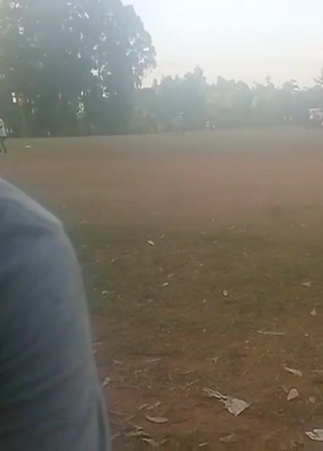 young person standing in front of a field. They are wearing a white t-shirt with the words "Feeling" and a shark design on it. The background shows a grassy field with trees in the distance. There are other people walking around on the field. The video is a bit blurry and the lighting is bright.