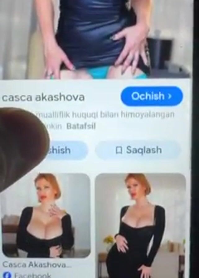 A phone screen is visible in the video, displaying a search results page in Uzbek for "casca akashova." The top result is an image of a woman in a black corset-style top, with a glimpse of turquoise underwear visible. Below this are additional images of the same woman, primarily in low-cut dresses. A finger touches the screen, indicating interaction with the search results. The lighting appears to be indoors.