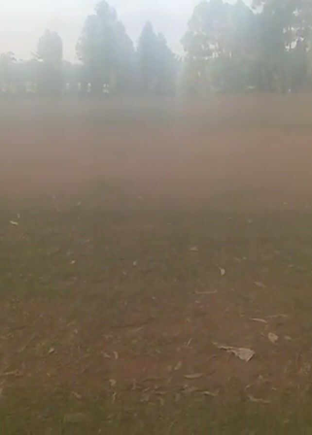 grassy field, possibly a sports field, with trees in the background. The visibility is poor due to fog or haze. There is some litter scattered on the ground. In the background, indistinct figures can be observed, possibly people. There is no clear indication of any specific actions or interactions.