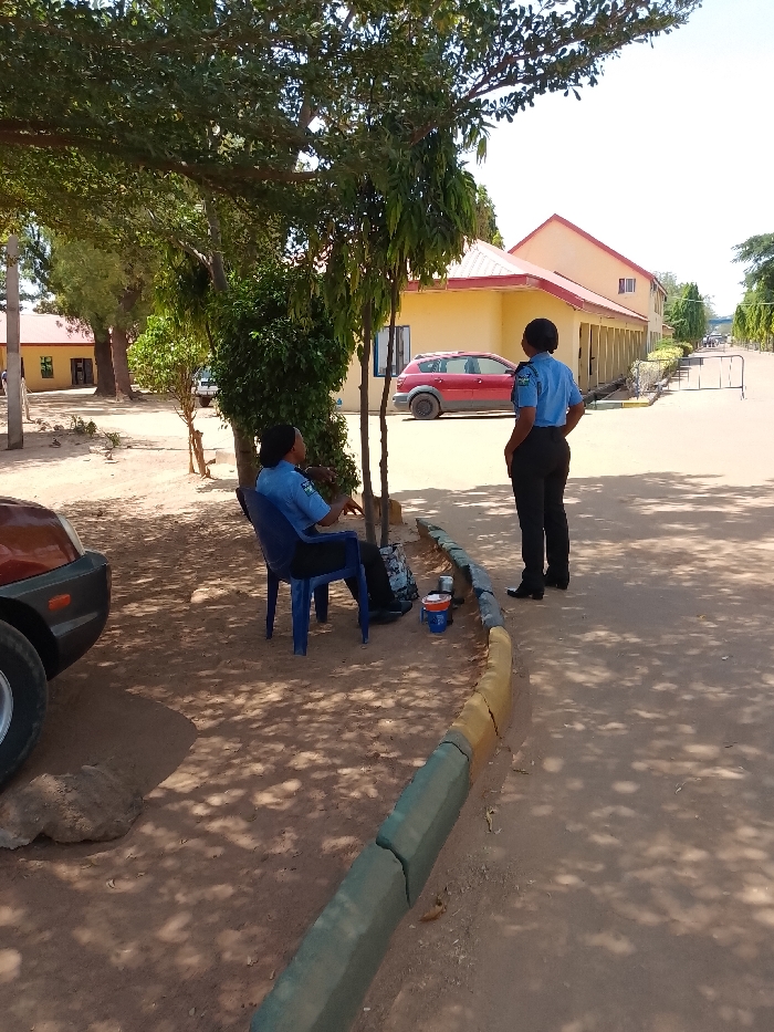 The scene depicts an outdoor area within what appears to be an administrative or institutional compound in Kabala, Nigeria, under clear, bright sunlight. Two individuals are present, both wearing blue uniform shirts with epaulets and dark trousers, consistent with security or police personnel. One individual is seated in a blue plastic chair on the dry, light brown dirt ground, positioned under the dappled shade of a leafy tree. A dark patterned bag and two small containers (one white, one blue) are on the ground near her. The second individual stands on a paved surface to the right, facing away from the camera, with hands placed on her hips, looking towards the right side of the frame. The environment includes a prominent two-story building in the background, featuring light yellow walls and a red corrugated metal roof, with a covered walkway supported by pillars. A red hatchback car is parked directly in front of this building. To the far left, the front wheel and part of a dark-colored vehicle are visible on the dirt ground. The dirt area transitions to a paved road on the right, separated by a low curb painted in alternating, cracked segments of green and yellow. Further down the paved road on the right, metal barriers are visible. Numerous trees with green foliage are scattered throughout the compound, casting distinct shadows on the ground.