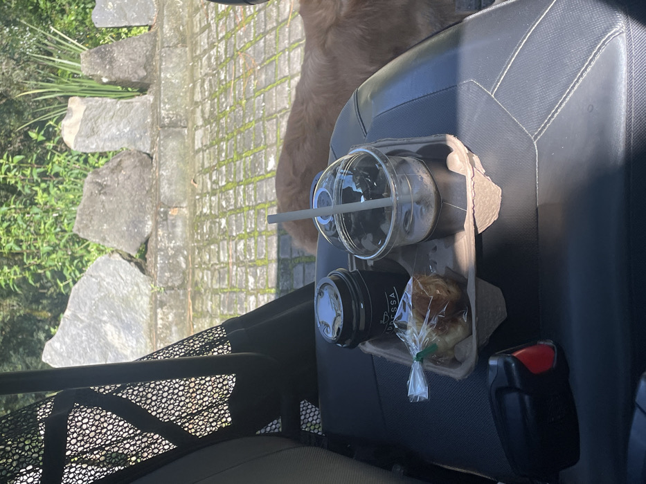 The image depicts a still life within a vehicle, looking out onto an outdoor scene in Avandaro, Mexico. Inside the vehicle, a dark gray seat surface holds a light brown, molded fiber drink carrier. The carrier contains one black disposable coffee cup with a lid, bearing the text "Espressa" and a coffee cup icon; one clear plastic cup with a dome lid and a white straw, containing a dark liquid approximately half full; and one small, round baked good wrapped in clear plastic with a green twist tie. A black seatbelt buckle with a red release button is visible on the seat to the lower left. A dark mesh panel is present on the left side of the frame, possibly part of the vehicle's window or door. Outside the vehicle, a paved surface consisting of rectangular blocks, possibly cobblestones or bricks, is visible, with green moss growing in the gaps. The hindquarters and lower back of a light brown or golden-colored dog are partially visible on this paved surface, low to the ground. Beyond the paved area, a concrete curb separates it from a natural barrier composed of several large, irregularly shaped grey and dark rocks. Lush green foliage and tall grasses are visible behind and between these rocks. The scene is illuminated by bright sunlight, indicating daytime. No human subjects are visible.