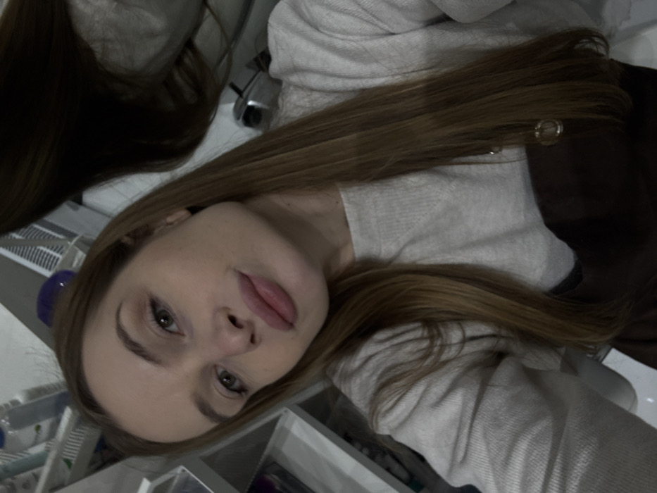 A young adult female is depicted in a close-up selfie, reportedly taken in Budva, Montenegro. She is positioned centrally, facing the camera directly, with her head slightly tilted. She has light brown, long hair parted down the middle and extending over her shoulders. Her eyes are green, and her lips are full with light pink lipstick. She wears a light-colored (likely white or light grey) long-sleeved ribbed top layered over a dark brown garment. The background on the left features a white shelving unit displaying various translucent and opaque bottles and containers. The background on the right includes a white, textured appliance, possibly an air conditioning unit or radiator, and a partially visible metallic fixture below it. A dark, amorphous reflection or figure is present in the upper right. The environment suggests an indoor, likely residential, setting with artificial illumination.