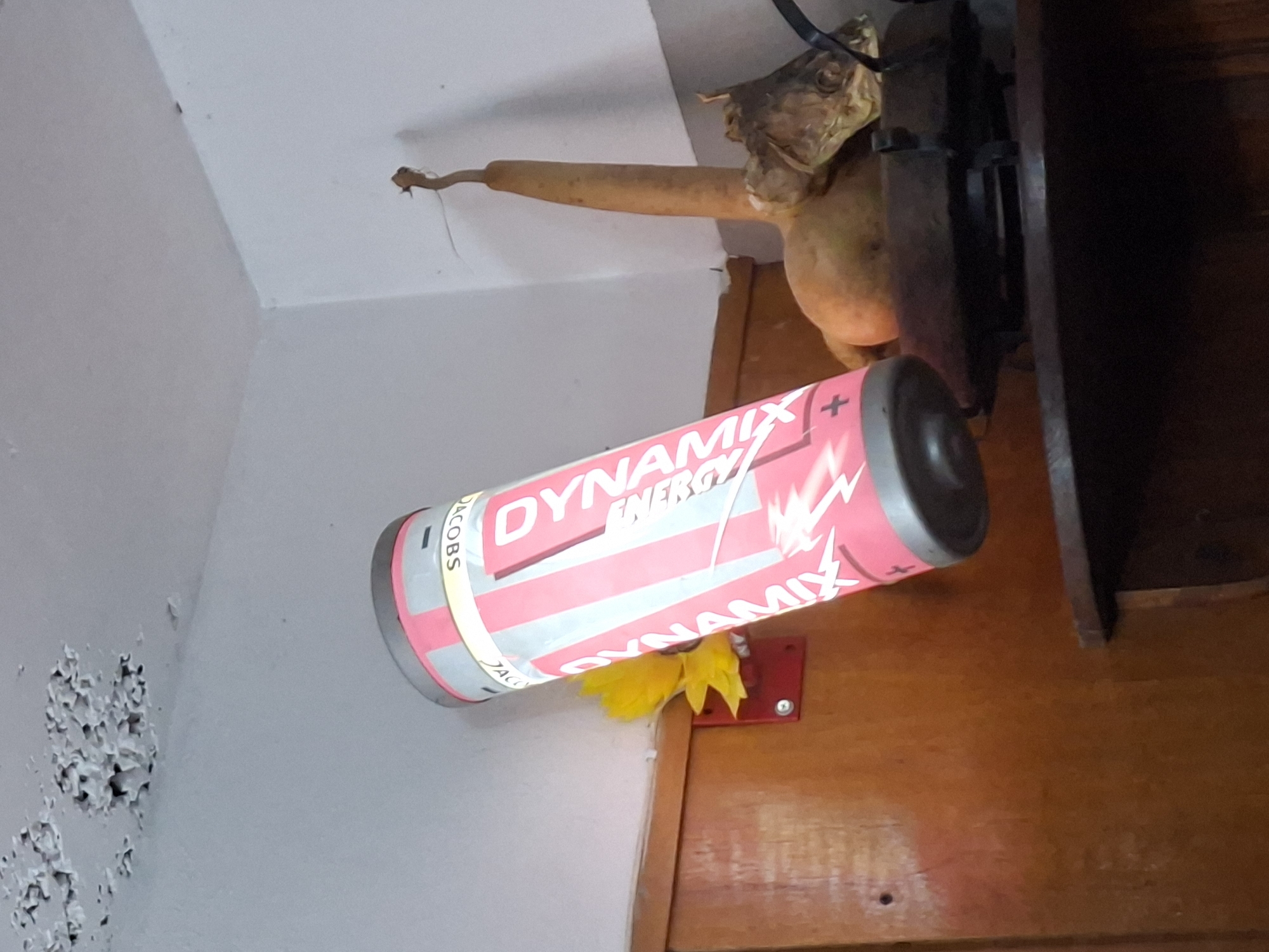 The scene depicts an interior view in Gabrovo, Bulgaria, focusing on a corner assemblage of objects. In the central-left, a large, cylindrical object, resembling an oversized energy drink can or battery, is positioned diagonally, tilted downwards to the right. Its surface is predominantly pink and silver-grey, bearing the prominent text "DYNAMIX ENERGY" and "JACOBS." A red, rectangular bracket with two visible silver screws is mounted on a dark brown wooden surface directly below and behind the cylindrical object. A yellow, possibly artificial, flower-like object is tucked behind this bracket. To the right, on the same dark brown wooden surface, an assortment of dried natural objects is displayed. This includes a tall, slender, light brown gourd standing upright against the white wall corner, alongside other more rounded gourds. A dried fish head is visible among these items, resting on the wooden surface. Below these natural objects, a dark, possibly cast-iron, decorative or functional object with a stand is situated on the wooden surface. The walls are white, meeting at an interior corner towards the upper right. The ceiling, visible in the upper left, is also white but shows areas of peeling paint or plaster. The overall lighting is even.
