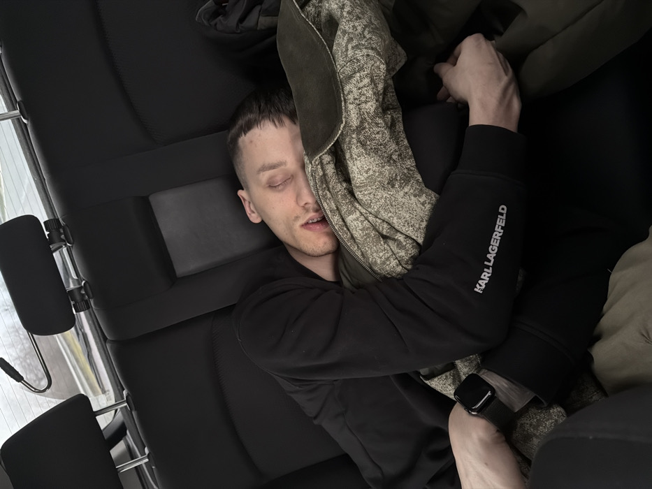 A young adult male is depicted asleep on the rear passenger seat of a vehicle in Neofit Rilski, Bulgaria
