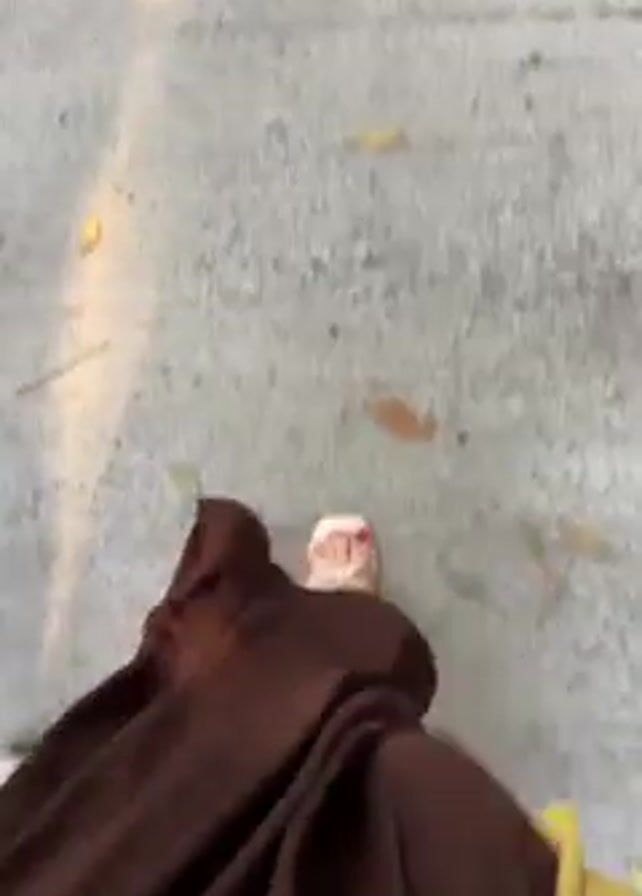 A first-person perspective video shows a person walking on a gray concrete surface. The person is wearing silver sandals, a long brown skirt, and a yellow garment is draped over their arm. The surface has fallen leaves scattered across it. The person takes steps forward and their shadow is cast on the ground.
