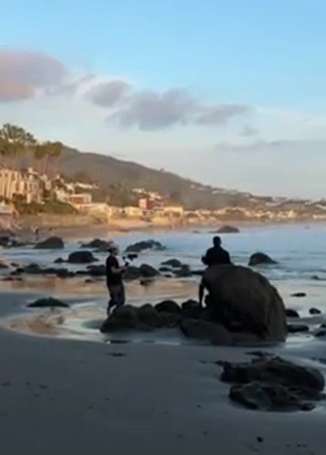 The video captures a scene on a beach, possibly in the late afternoon or early evening, given the soft lighting and the position of the sun. There are two individuals visible: one is standing on a large rock near the water's edge, while the other is positioned on the beach holding a camera with a stabilizing gimbal. The individual on the rock appears to be posing or speaking, as they gesture with their hands. The camera operator seems to be filming them. The beach is sandy with scattered rocks of varying sizes. The ocean water is reaching the shore with small waves. In the background, there is a hillside covered with houses, trees, and vegetation. The sky is a mix of blue and clouds, with some hints of pink or orange from the setting sun. Overall, the scene appears to be a film shoot or a photography session taking place in a coastal location.