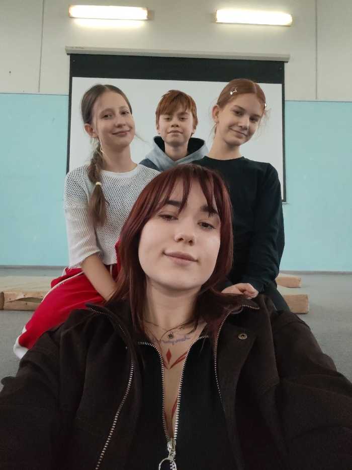 An indoor, frontal group portrait in an unidentifiable room, possibly a classroom or rehearsal space, located in Rostov-on-Don, Russia. Four individuals are present, arranged in two rows. In the foreground, a young adult female with reddish-brown hair and bangs is depicted from the chest up, holding a device to capture a selfie. She wears an open dark brown zippered jacket over a dark ribbed top, exposing a small red geometric design on her upper chest. Layered necklaces are visible. She looks directly at the camera with a faint smile. Behind her, three younger individuals are positioned. To the left, a pre-teen or early teenager female with a long braid and a yellow hair tie wears a white mesh-like top and red track pants with white stripes; she smiles faintly at the camera. Centered behind the foreground person, a pre-teen or early teenager male with short reddish hair wears a light grey hooded sweatshirt; he looks neutrally at the camera. To the right, another pre-teen or early teenager female with light brown hair and small white hair clips wears a black long-sleeved top; she smiles faintly at the camera, with her right hand resting on the foreground person's upper back. The background features a white wall with a light blue lower section. A large, blank white projector screen is lowered against the white wall. Two rectangular fluorescent light fixtures are visible on the white ceiling. The floor appears to be a light grey carpet or mat, with several rectangular wooden blocks or props visible on it behind the subjects.