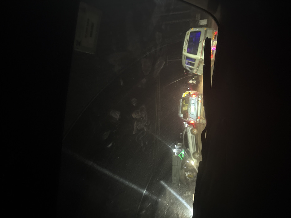 From inside a vehicle, a night scene reveals two white vans, seemingly emergency vehicles, their lights illuminated