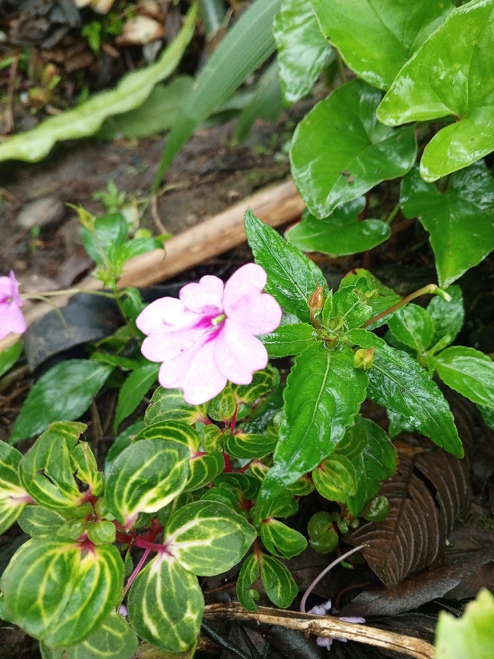 A close-up captures a vibrant garden scene. A light pink flower, likely an impatiens, is centrally placed. Its petals are dotted with raindrops. Lush green foliage surrounds the flower, with some leaves exhibiting distinct yellow veining. Various shades of green dominate, from the dark, glossy leaves in the background to the lighter, patterned leaves in the foreground. The scene is grounded in a natural setting with soil and fallen leaves visible. The overall impression is one of freshness and natural beauty.