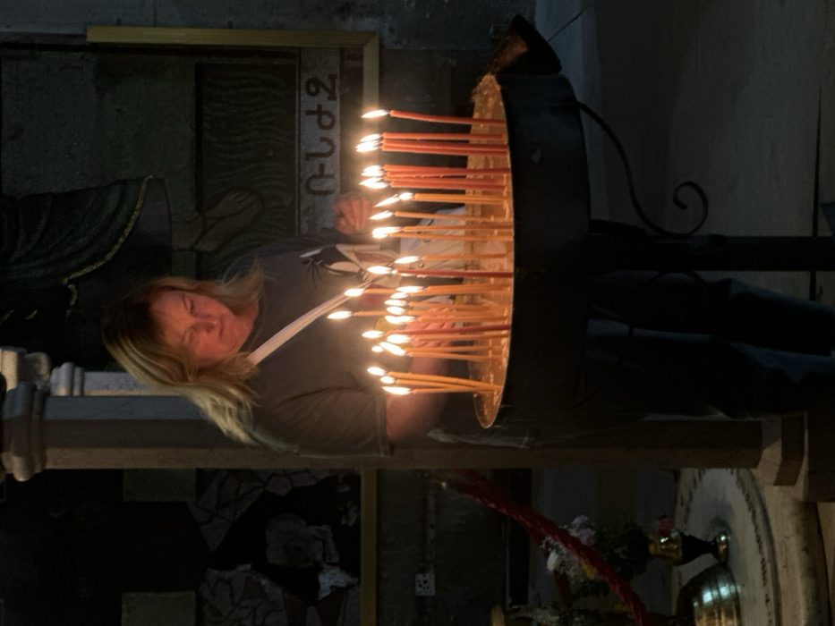 A fair-skinned adult female, with light blonde hair and wearing a grey short-sleeved top with a white cross-body strap, stands facing a large, dark metal circular candle stand. Her gaze is directed downwards towards the numerous lit wax candles, predominantly yellow and orange/red, within the basin. Her hands are positioned above the candles, indicating an action related to lighting or tending them. The candle stand rests on an ornate dark metal base. The environment is dimly lit, suggesting an interior religious setting. To the left, a light-colored stone column is visible, along with a small floral arrangement in an ornate golden vase and a red rope barrier. The background consists of a dark wall featuring a partially visible religious fresco depicting a figure in a green robe and stylized water. Below the fresco, Armenian script, specifically the letters "ԴՈՂ," is discernible. The primary illumination in the scene emanates from the collection of burning candles. This scene is located within the Armenian Cathedral of St. James, situated in the Armenian Quarter of the Old City, Jerusalem, Israel.