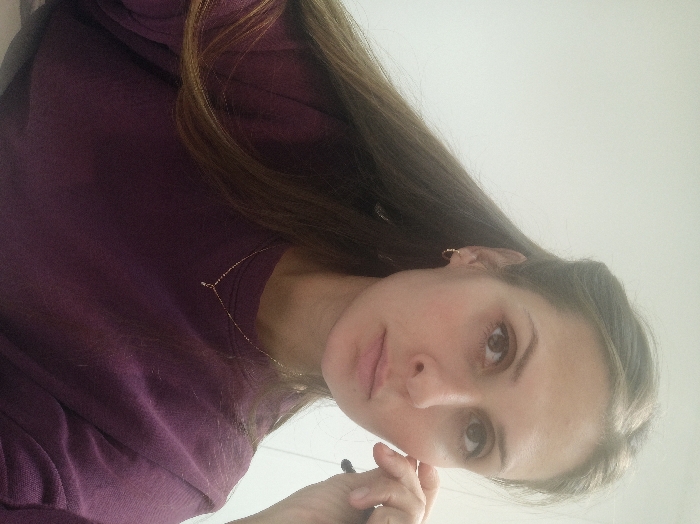 A female subject is depicted indoors against a plain, light-colored wall. She has long, dark brown hair, partially styled away from her face, and wears a dark maroon long-sleeved top. A thin gold chain necklace with a small, light-colored pendant is visible around her neck. A small gold hoop earring is present in her visible left ear. Her right hand is raised, with fingers touching her right cheek and jawline, possibly holding a thin, dark object between her thumb and index finger. The subject looks directly forward. The location within Irkutsk, Russia, cannot be determined from the visual information provided.
