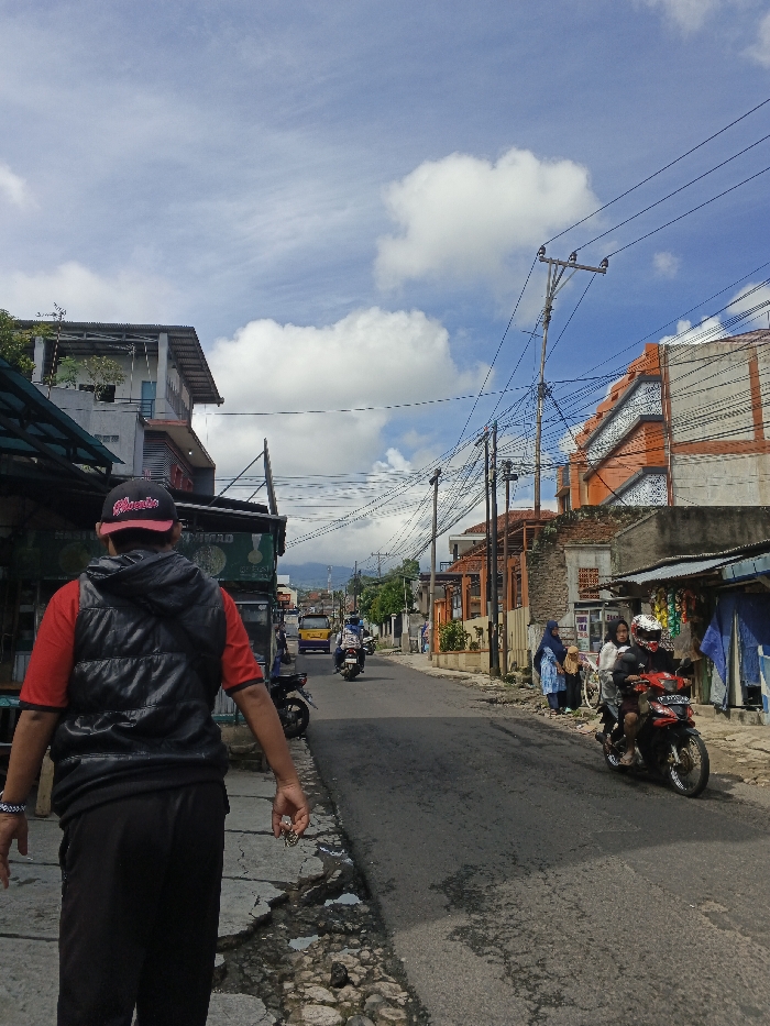 An overhead view captures a street scene in ឃុំ ផាត់សណ្ដាយ, Cambodia, under a partially cloudy blue sky. In the foreground, a male individual is observed from behind, walking towards the viewer's right along the edge of the asphalt road. He wears a red t-shirt, a black quilted vest, black pants, and a black baseball cap with a red brim and a white logo. His right hand holds a small metallic object, possibly keys. The immediate ground beneath him consists of cracked and uneven concrete. The asphalt road, exhibiting signs of wear, extends into the midground and distance. On the right side of the road, a red motorcycle with two occupants is positioned; the driver wears a white helmet, and the passenger has dark hair. Further down the road, another motorcycle and a yellow vehicle, possibly a van or small bus, are visible, both moving away from the viewer. Utility poles, heavily laden with numerous black electrical and communication wires, line the right side of the street. Buildings of varying heights and architectural styles line both sides of the thoroughfare. On the left, multi-story structures with balconies and corrugated roofs are visible, interspersed with ground-level shops or stalls featuring awnings. On the right, buildings display orange and grey facades. A group of at least three individuals, including one wearing a light blue hijab, stands near a covered stall on the right sidewalk. A bicycle is parked nearby. In the far background, distant hills or mountains are discernible beneath the sky.