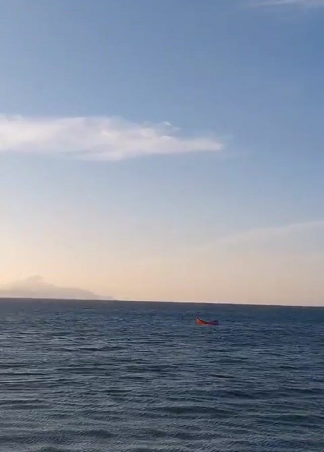 small orange boat bobbing on the water, under a blue sky with scattered white clouds
