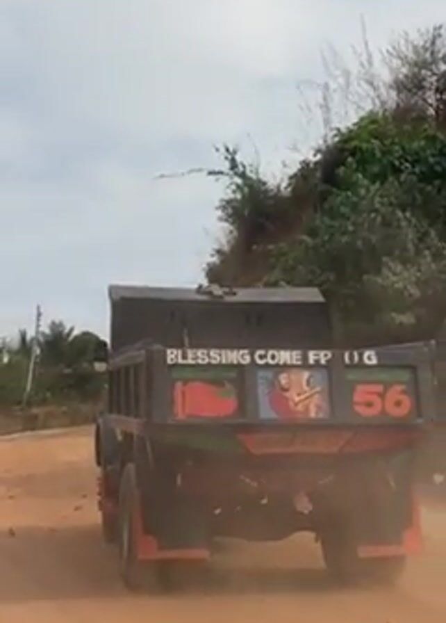 A truck drives away from the camera on a dirt road. The truck is black and red with white lettering that reads, “BLESSING COME FP UG 56”. There is a red flag and a picture of a man on the back of the truck as well. Trees and shrubbery line the side of the road. The sky is partly cloudy. The truck kicks up a cloud of dust as it drives.