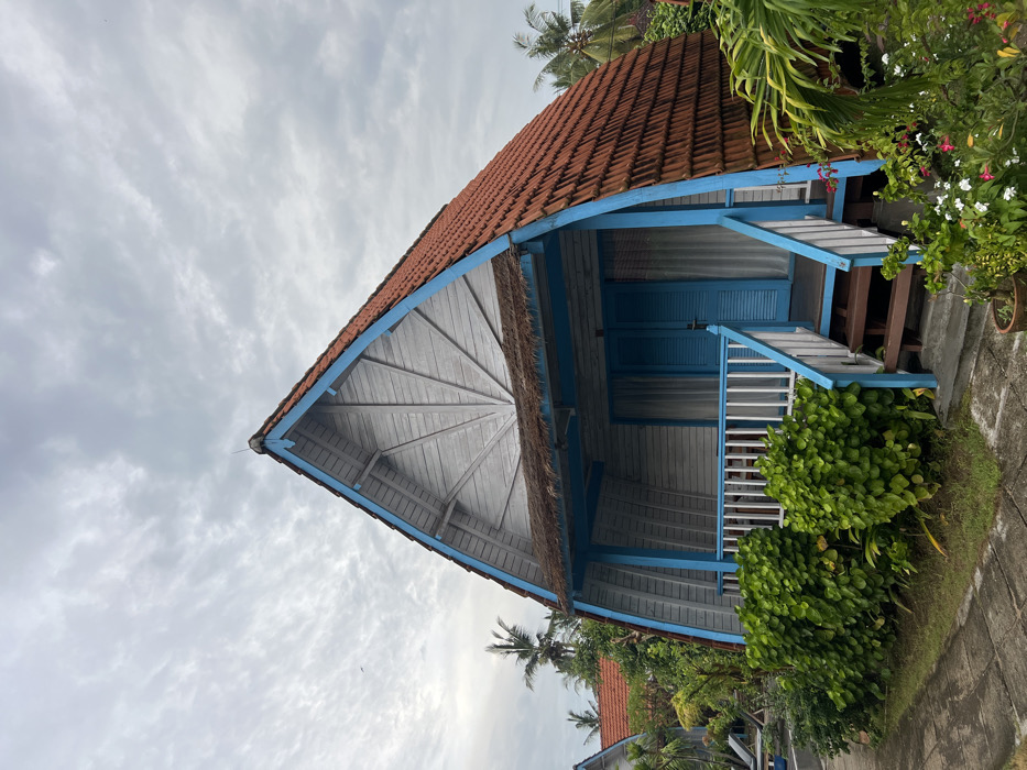 A vibrant building with a red-tiled roof and blue trim under a cloudy sky. The structure features a triangular gable end with light grey wood panelling radiating from a central point. A small porch with white railings and blue accents is present, accessed by wooden steps. Lush green vegetation surrounds the building, suggesting a tropical setting. Another building with a similar roof is visible in the lower background.