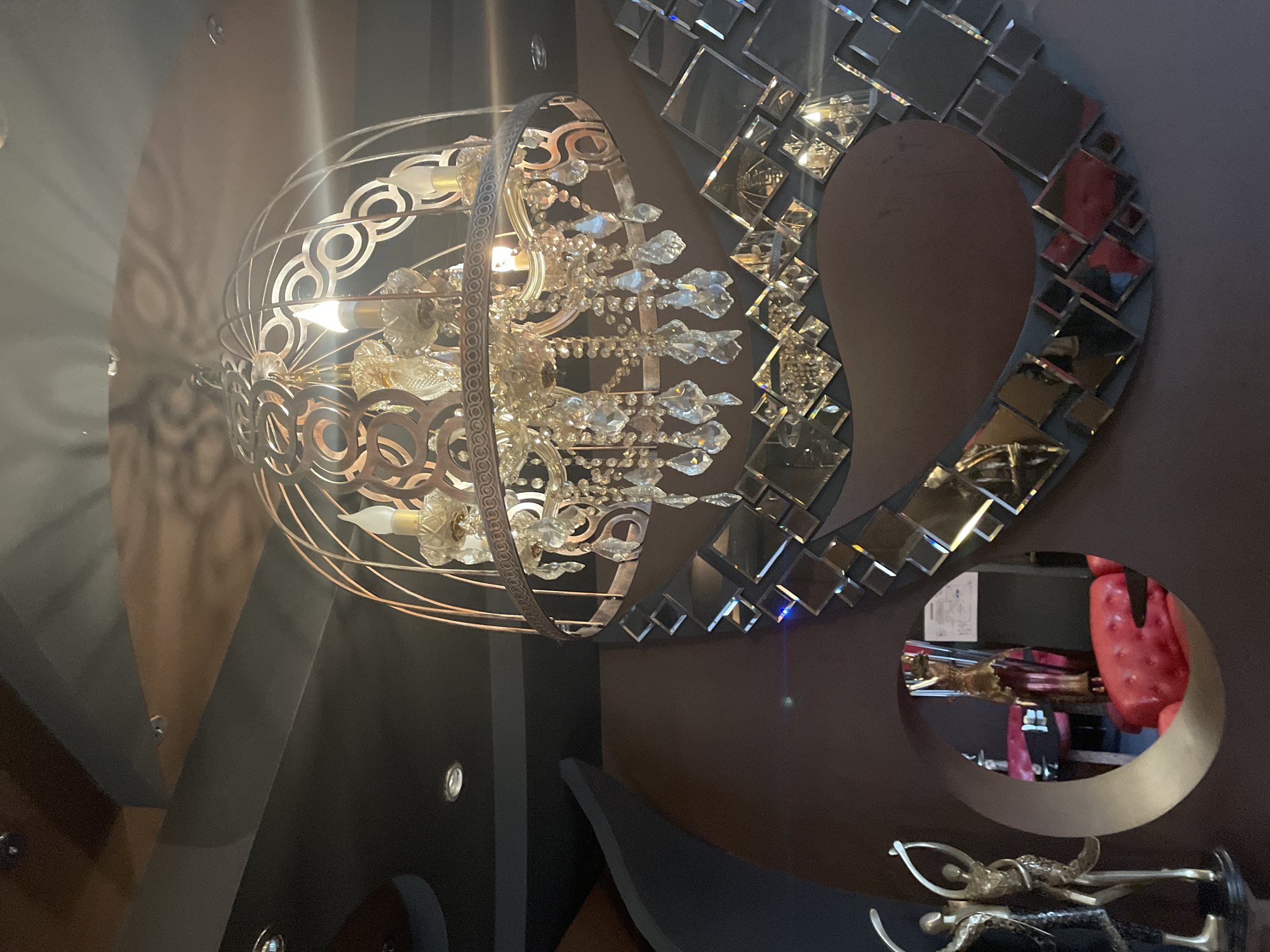 The image presents a section of an interior, likely the ceiling area of a room. A decorative, spherical chandelier is prominently featured, constructed with a metal frame and adorned with numerous crystals. Adjacent to the chandelier is a curved, mirror-tiled wall design. A circular opening in the wall reveals a reflection of objects, including what seems to be a sculpture and perhaps a red, textured object. The room's design incorporates dark paneling with recessed lighting. The exact location within Sofia, Bulgaria, is not deducible from the visual elements provided.
