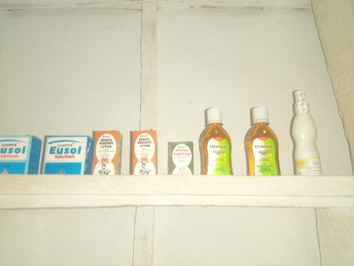 This forensic image captures a static indoor scene in Ota, Nigeria, displaying various medicinal products arranged on a narrow, light-colored shelf against an off-white panelled wall. From left to right, the shelf holds two blue and white cardboard boxes, each marked "LAONTX EuSol Solution". Adjacent to these are two identical orange and white cardboard boxes, labeled "MCKP BENZYL BENZOATE LOTION", both featuring a graphic of an individual scratching an arm. Following these is a small, partially obscured green and white box, identifiable as "MCKP Gentian Violet Paint". Next are two amber-colored liquid bottles with white caps, clearly marked "TETMOSOL MEDICATED SOAP". The arrangement concludes with a single white, ergonomically shaped opaque bottle with a white cap, whose label is largely illegible. The background wall exhibits vertical and horizontal seams, indicating panel construction. No individuals or actions are depicted in the scene.