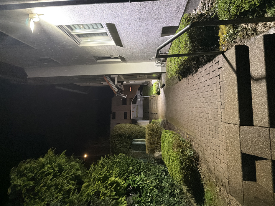 The image depicts a nighttime scene in a residential area of Neu-Ulm, Germany. The perspective is from the base of a short flight of three concrete steps, looking down a paved walkway. To the immediate right, a dark metal handrail ascends alongside the steps and ends where the walkway begins. Adjacent to the right side of the walkway is a low hedge of manicured green bushes, bordering the white stucco wall of a building. This building features a bright, wall-mounted exterior light fixture above a double-pane window with horizontal blinds, illuminating the immediate area. The walkway, constructed from interlocking grey paver stones, appears damp and extends downhill, curving slightly to the left. On the left side of the walkway, dense green bushes and a tall evergreen tree line a low metal fence. Further down the path, another segment of a trimmed hedge is visible. In the midground, a porch-like entrance with a small overhanging roof is visible on the building to the right. Beyond the illuminated section of the walkway, a dark area leads to what appears to be a parking space. In the background, a white commercial-style van with orange lettering is parked facing left, partially obscured by a railing. Behind the van and a lower building, the dark outlines of a larger, multi-story residential building are visible. A street light with an amber glow is discernible in the upper left background, and the sky is completely dark. No individuals or active interactions are present in the scene.