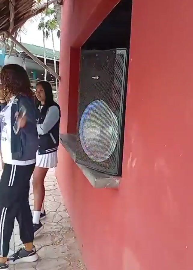 A short video begins focused on a red building under a thatched roof. A speaker with rainbow lights is embedded in the wall of the building. Three young women are standing by the building. One is wearing a white pleated skirt and a blue jean jacket. Another is wearing dark pants with a white stripe down the side and a grey hoodie. The third young woman is wearing denim shorts and a long-sleeved black shirt. The camera rotates to show a walkway paved with rough tan stones, and a pool. Several palapas are visible. Palm trees are in the background. The sky is overcast. The video ends.