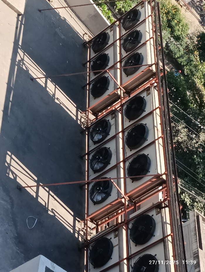 A row of industrial air conditioning units, arranged vertically, cling to the side of a building. The units are encased in a rust-colored metal frame secured to the wall. The fan blades are black and visible through the grill. Shadows from the support structure cast angular lines across the gray building facade. Foliage from nearby trees is visible in the background. The timestamp at the bottom indicates "27/11/2025".