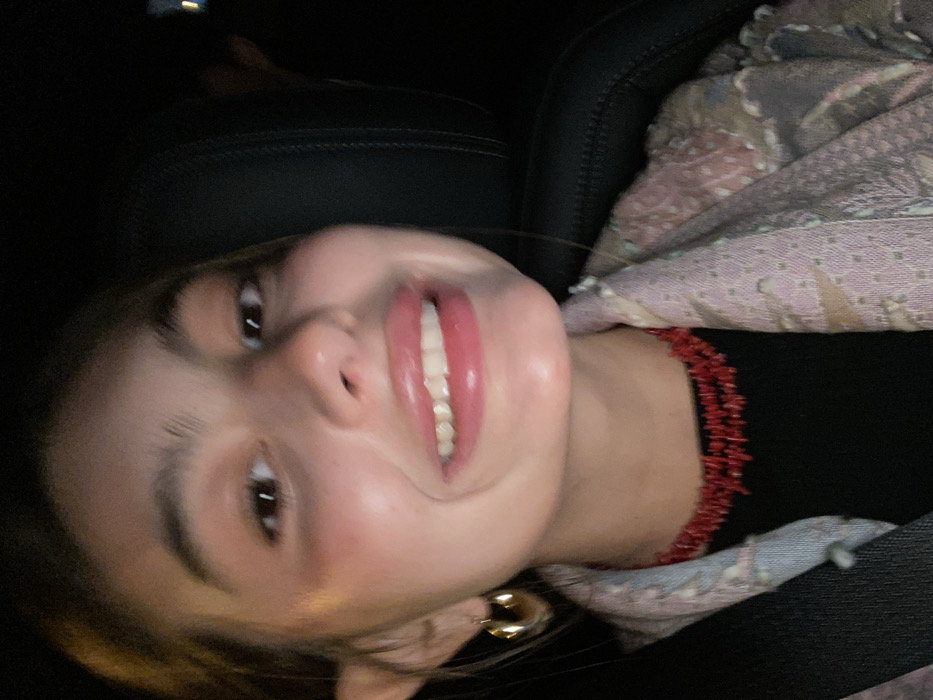 A young woman smiles, revealing her white teeth. She wears a black top and a chunky red necklace, draped with a patterned scarf in light pink and gray. The photo appears to be taken from a low angle, possibly inside a car, with the black leather seat visible in the background. Her complexion is fair, and her hair is dark. She has an earring in her left ear.