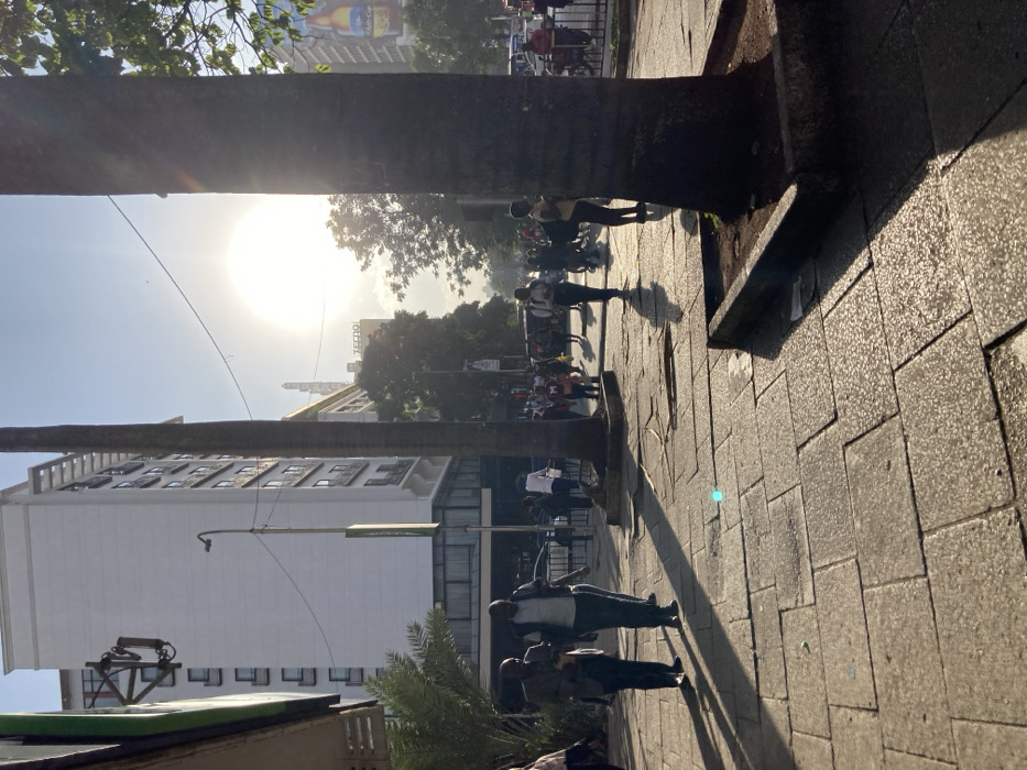 The image depicts a busy urban street scene in the Central Business District (CBD) of Nairobi, Kenya, likely Kenyatta Avenue, during morning or late afternoon hours. The scene is dominated by strong backlighting from a low, bright sun positioned centrally in the upper right quadrant, creating significant glare and casting long, dark shadows toward the foreground. The immediate foreground and mid-ground comprise a paved sidewalk constructed of rectangular and square concrete slabs, exhibiting visible wear and some unevenness. A raised, concrete-edged planter box, containing soil and a thick palm tree trunk, is visible in the lower right. Another prominent palm tree trunk stands in the mid-ground on the right, partially obscuring the view further down the street. On the left, a multi-story white building with a modern facade, dark windows, and distinct architectural ledges is visible. A green banner hangs vertically from a lamppost in front of this building. Further down the street, additional buildings are discernible, including one with the illuminated "TECNO" brand sign. On the far right, a large billboard displaying the "White Cap" logo (a beer brand) is visible on a distant building. Numerous individuals are present, mostly silhouetted by the backlighting. In the left foreground, two men walk towards the viewer on the sidewalk; one in a light-colored upper garment and the other in dark clothing carrying a backpack. Multiple pedestrians are observed moving on the sidewalk and crossing the street in the mid-ground, indicating a high level of activity. A metal railing separates the sidewalk from the main street, where several vehicles and additional pedestrians are visible. Overhead utility wires crisscross the sky. The overall environment suggests a bustling commercial area.