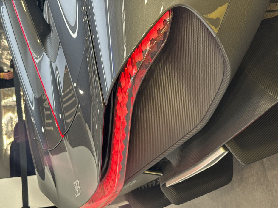 - "The image displays a detailed, close-up view of the rear-right section of a dark metallic grey Bugatti automobile, likely a display model given the pristine condition and indoor setting" by FM-o65VI3, licensed under CC BY 4.0