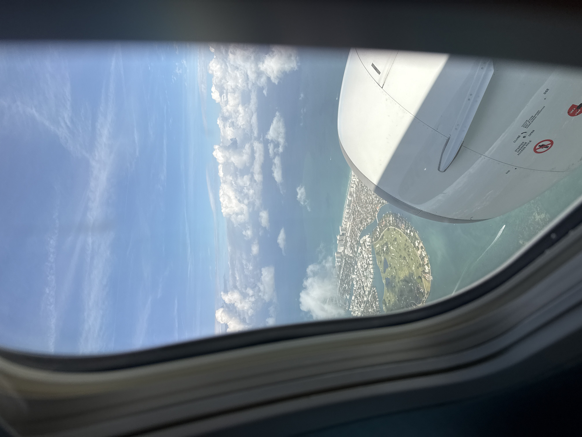 View from an airplane window over North Bay Village, Florida, USA. The airplane's engine nacelle is visible in the upper right quadrant. Below the engine, an island with a golf course and surrounding residential buildings is seen. The Atlantic Ocean extends beyond the island, with scattered clouds visible in the sky. The sky transitions from clear blue to hazy near the horizon. A small boat is visible in the water near the island. The window frame is visible in the foreground.