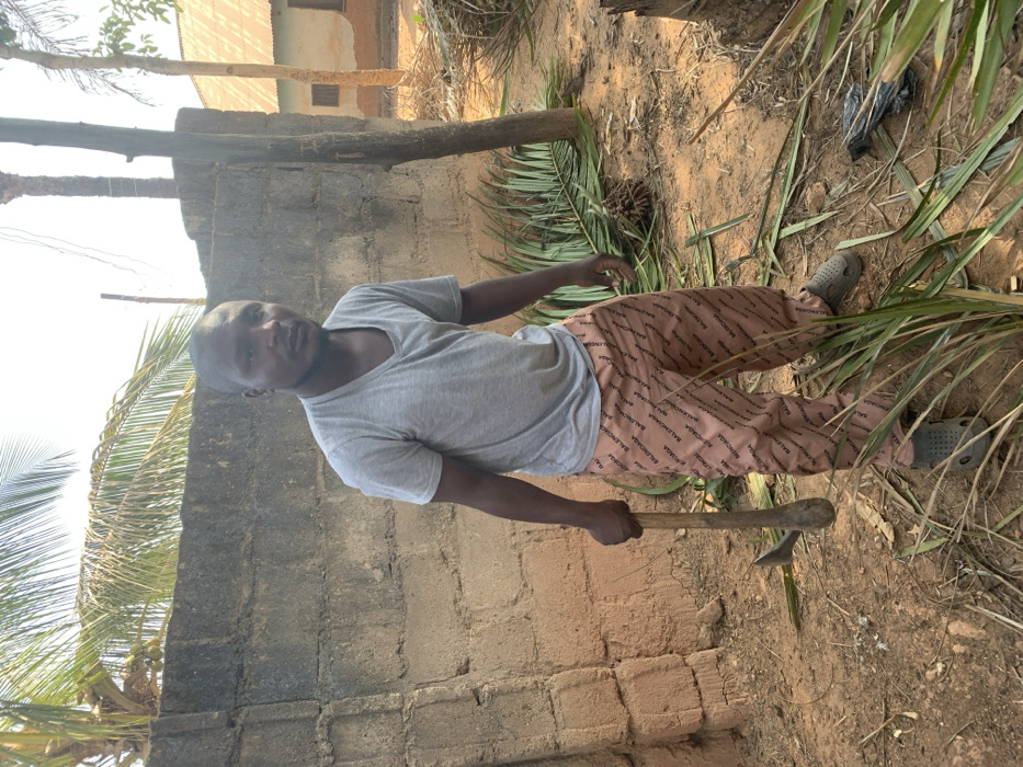 A single adult male stands outdoors in the city of Unknown, Unknown. He is positioned centrally, facing slightly left of the camera with a neutral expression. The man has short, dark hair and light facial hair. He wears a light grey V-neck t-shirt, loose-fitting light brown pants patterned with diagonal "BALENCIAGA" text in black, and dark grey Croc-style clogs. In his right hand, he grips a wooden-handled tool resembling a mattock or pickaxe, with the metal head pointed downwards. The ground is dry, reddish-brown earth with scattered green palm fronds and other plant debris. To the man's right, a cluster of dark, oval-shaped fruits or seeds, consistent with palm fruits, lies on the ground, along with a crumpled black plastic bag. Behind him, a weathered concrete block wall, composed of reddish-brown blocks with dark stained areas, runs horizontally. Above the wall on the left, green palm fronds with visible coconuts extend into the frame. To the right of the man and behind the wall, a slender tree trunk stands, and further back, a building with an orange-brown corrugated metal roof and light-colored walls is partially visible. The scene is illuminated by natural sunlight, casting soft shadows.