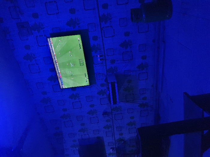 A TV is mounted on a blue patterned wall, displaying a soccer match. An overhead projector is situated near the top of the wall. The space is bathed in blue light, casting shadows and creating an immersive environment. Elements of furniture are visible in the lower right corner, suggesting the space is a living area or entertainment room.