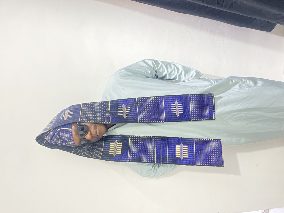 A male subject stands against a plain, light-colored wall, likely indoors, in Joma, Ghana. The individual wears a light blue, long-sleeved garment and black sunglasses. A dark blue woven fabric headpiece, intricately patterned with gold and lighter blue geometric designs, covers the head and extends in two vertical strips over the shoulders, partially obscuring the front of the garment. The subject's hands are not visible. A dark vertical fabric element is partially observed on the far right of the frame.