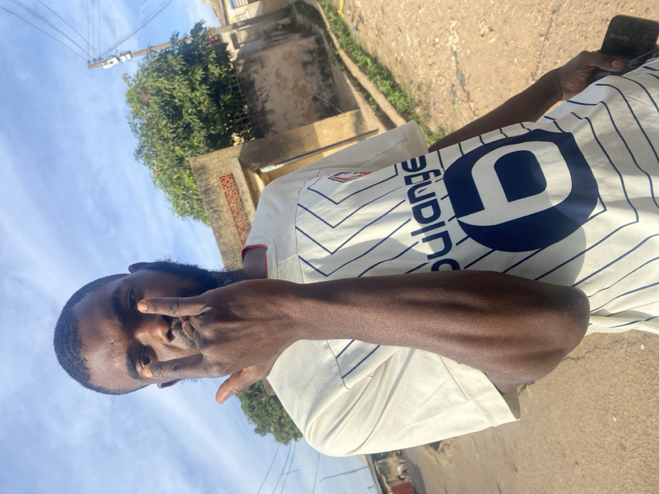 A man poses outside, wearing a white striped jersey with a large "O" logo on the back. He makes a hand gesture near his face with the sky in the background. Trees, buildings, and a utility pole are also visible. The picture is slightly rotated. He's holding a phone in his left hand.