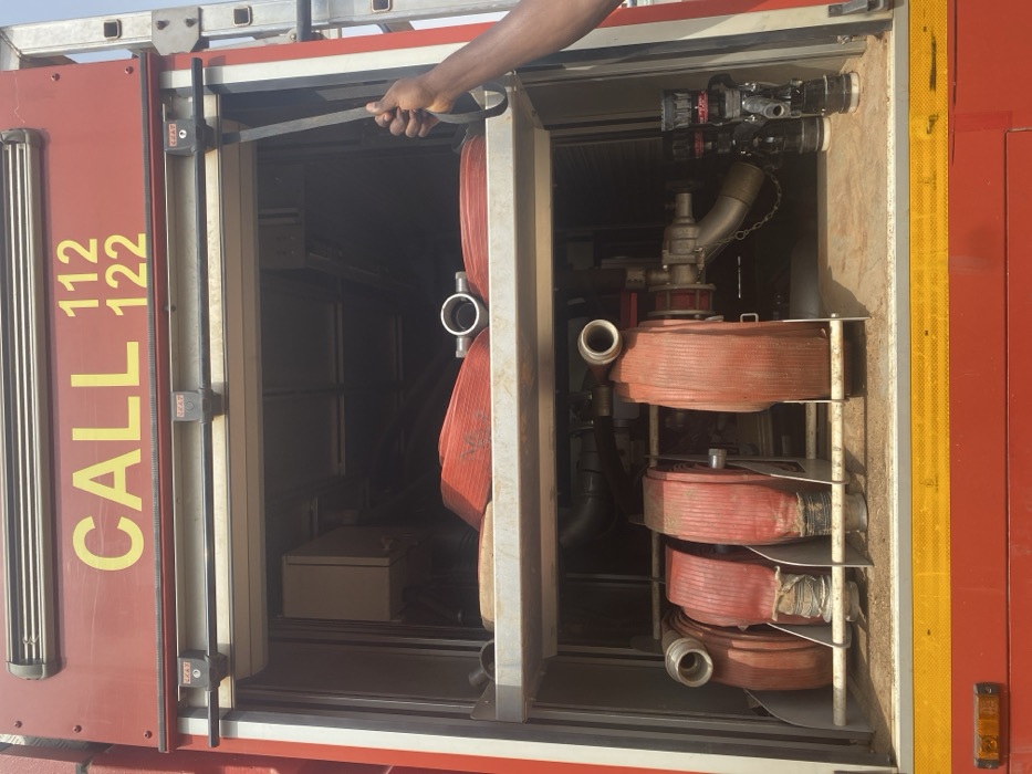A red fire truck's open equipment compartment is depicted in Unguwan Dosa, Nigeria