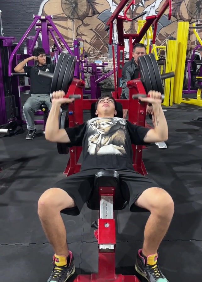 young man in a gym using a weight machine to perform a seated shoulder press. He is wearing a black t-shirt, black shorts, and colorful sneakers. The machine is red and black. In the background, other people are using other machines in the gym, which features a large mural of a pit bull on one wall. The gym has black floors, and several machines are purple and yellow. The phone is placed underneath the seat.