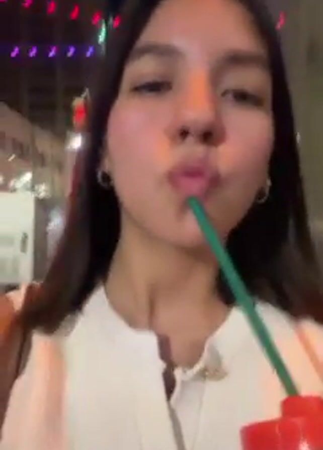 A young woman drinks from a bottle with a green straw. She has dark hair, hoop earrings, and wears a white cardigan with gold buttons. The bottle has a red cap. The background shows city lights at night and a building. The woman appears to be walking while holding the camera.